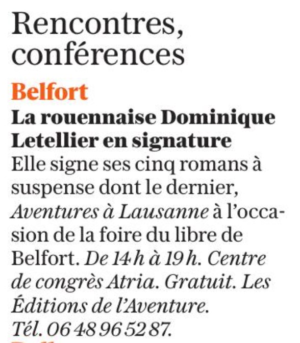Outre de très nombreux sites, ceux de l'organisme officiel du tourisme pour toute la Suisse, Suisse Tourisme, et de la Ville de Lausanne, ont annoncé ma signature en avant-première de mon 5e roman, Aventures à Lausanne